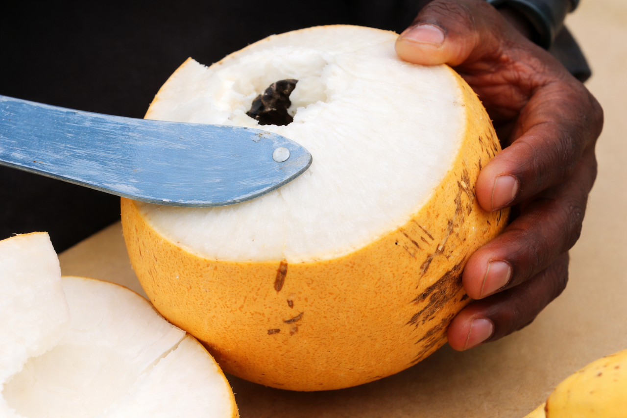 Il vero segreto del tambili è il suo liquido interno. Basta aprire la parte superiore del frutto per ottenere una bevanda limpida, fresca e pronta da bere.